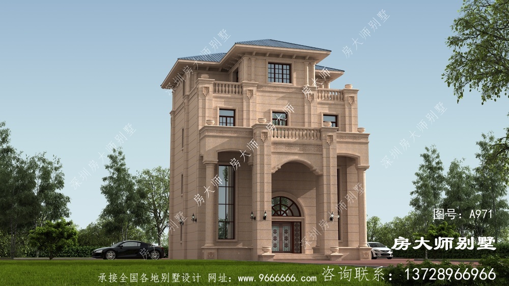 A971号别墅外墙主要材料:荔枝面沙漠棕纯石材干挂、屋面310X310S瓦