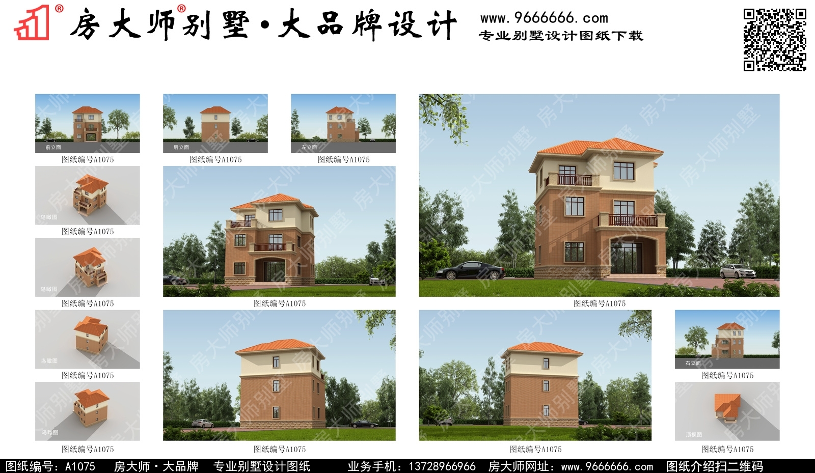 A1075号别墅外墙主要材料:真石漆、外墙劈开砖、铁艺栏杆、水泥构件、蘑菇面黄锈石、310X310S瓦