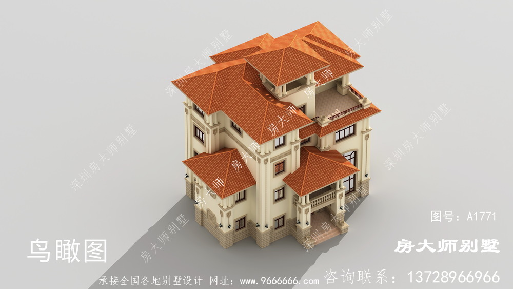 A1771号别墅外墙主要材料:真石漆、水泥构件、荔枝面黄锈石、310*310S瓦 |