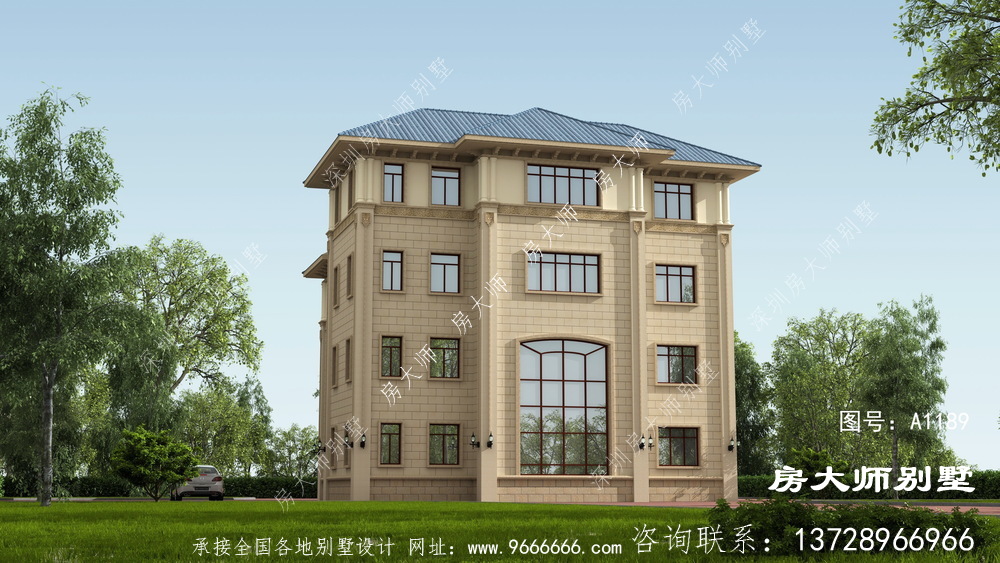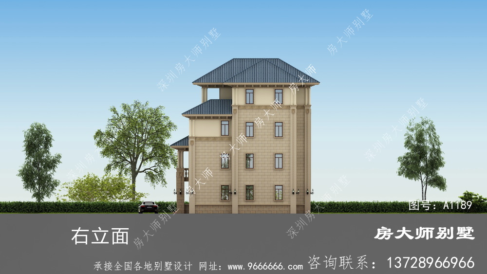A1189号别墅外墙主要材料:水泥构件、真石漆、310X310S瓦、外墙砖、荔枝面黄锈石