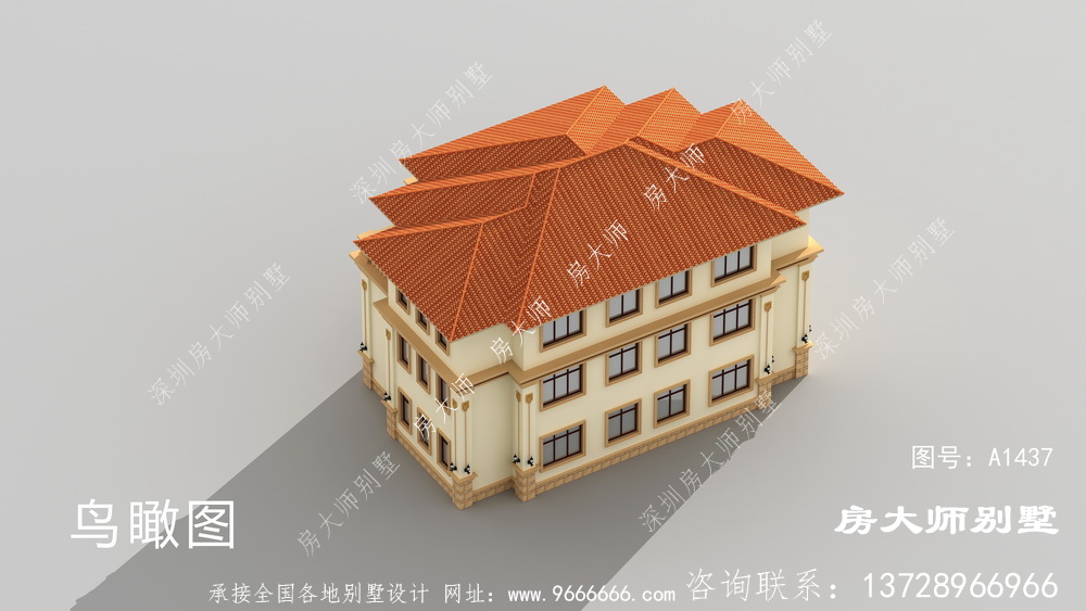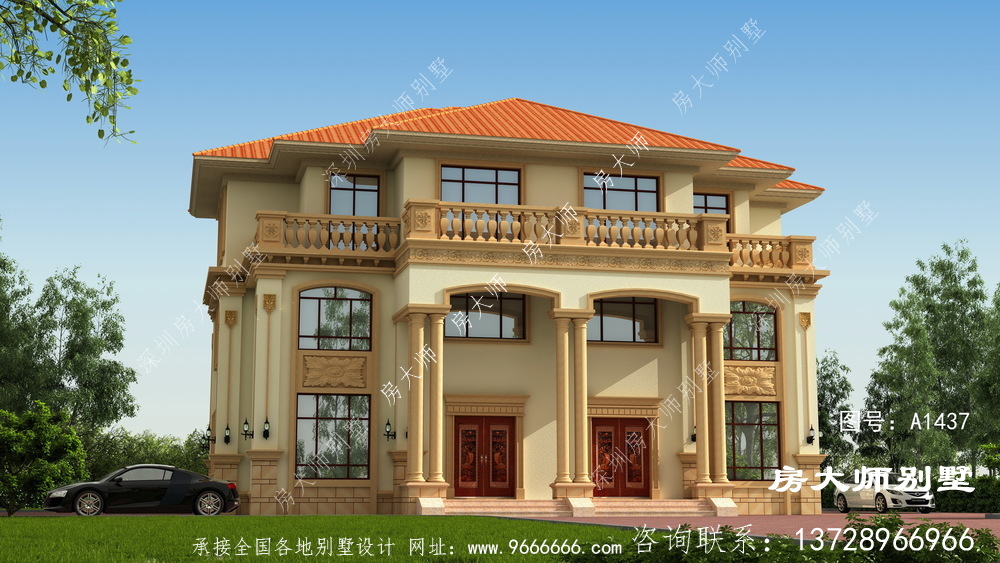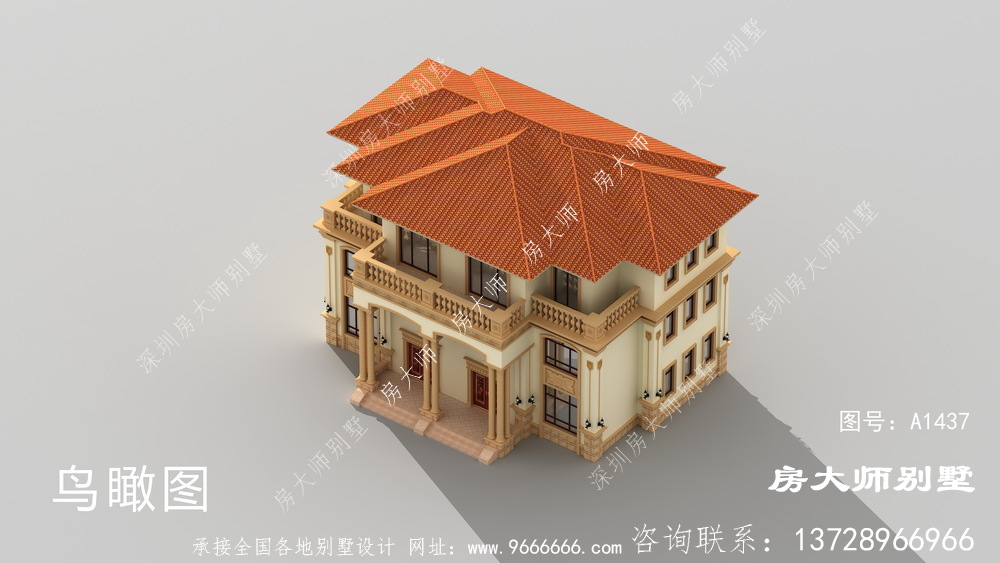A1437号别墅外墙材料:真石漆、310X310S瓦、砂岩石、GRC水泥构件、葫芦柱栏杆 |
