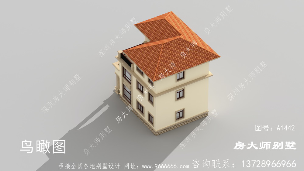 A1442号别墅外墙主要材料:蘑菇面黄锈石、真石漆、310X310S瓦