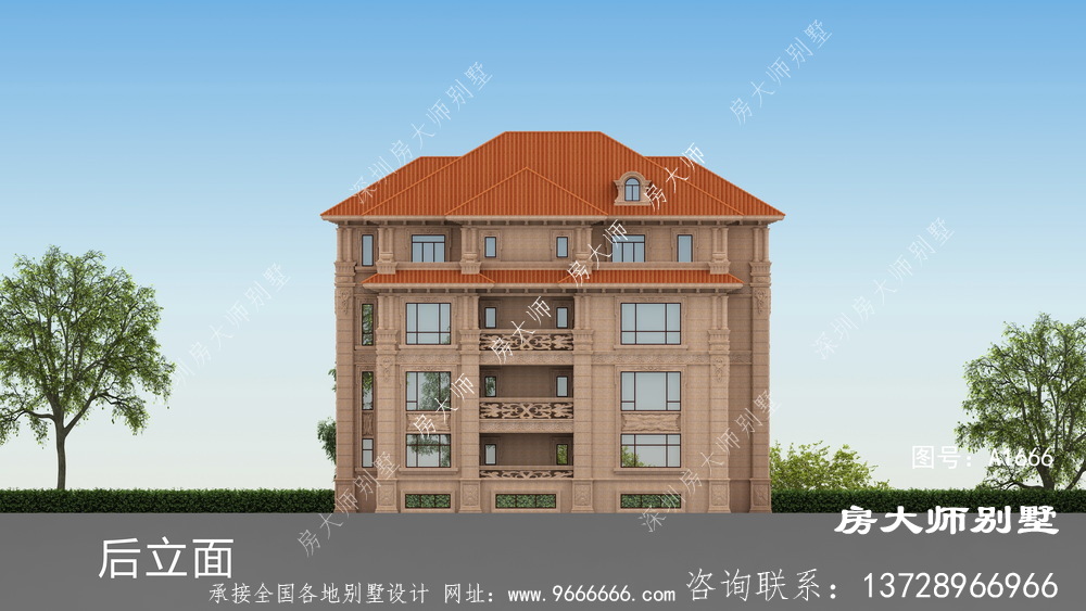 A1666号别墅外墙主要材料:外墙纯石材干挂、永定红石材、310X310S瓦