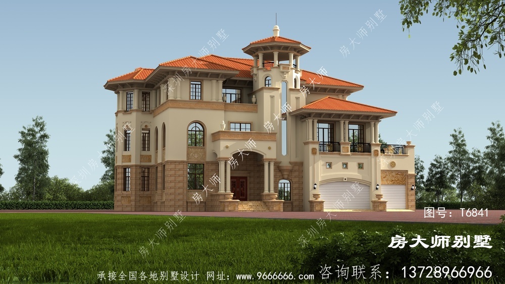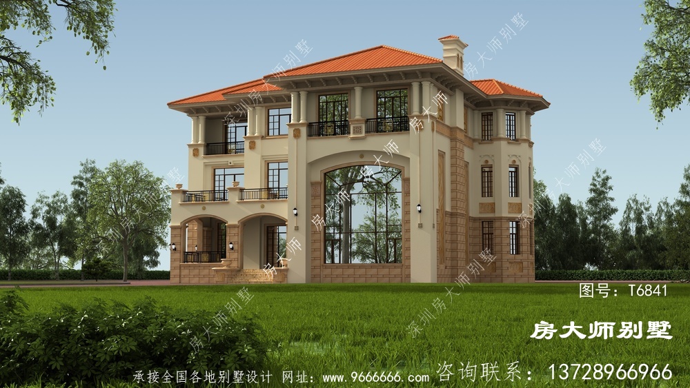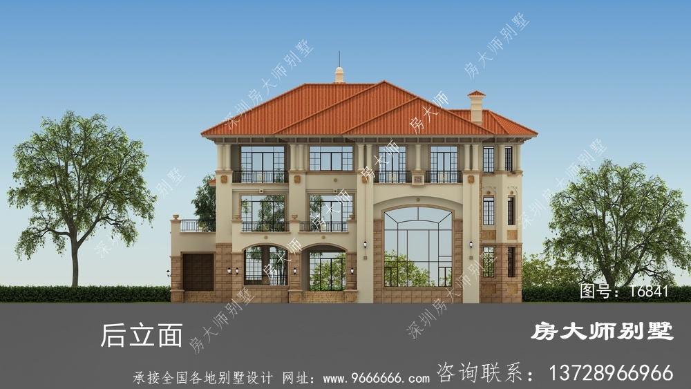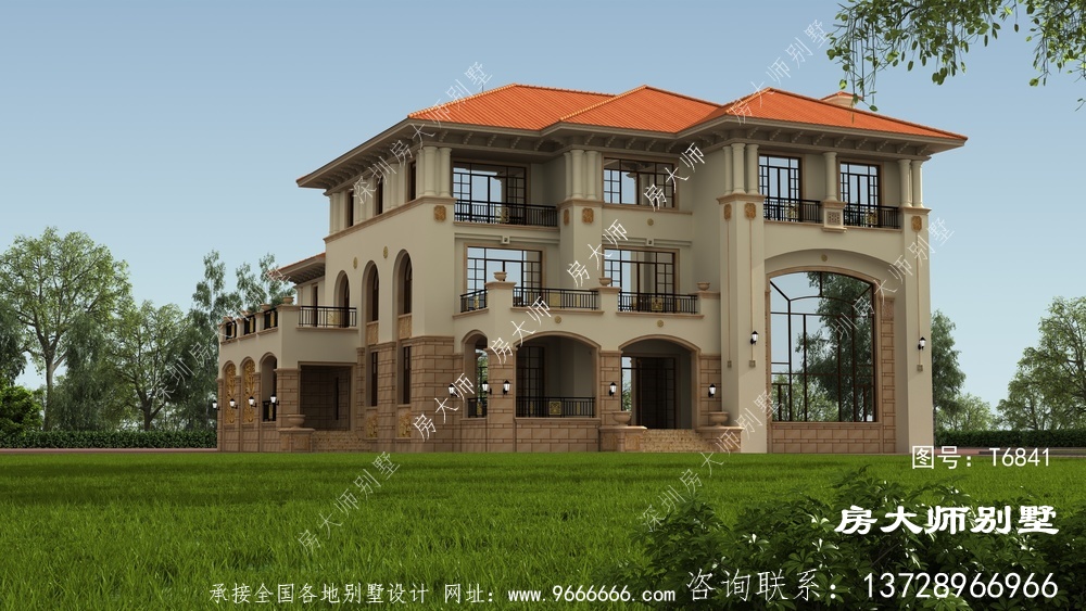 T6841号别墅外墙主要材料:砂岩石、真石漆、310X310S瓦、铁艺栏杆 |