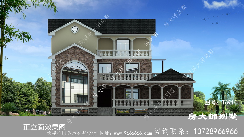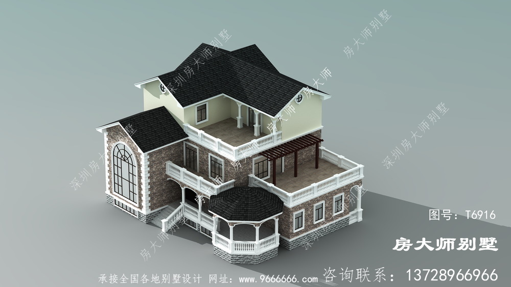 t6916号别墅外墙主要材料:天然岩石漆、外墙劈开砖或文化石、水泥瓦黑色、GRC水泥构件栏杆