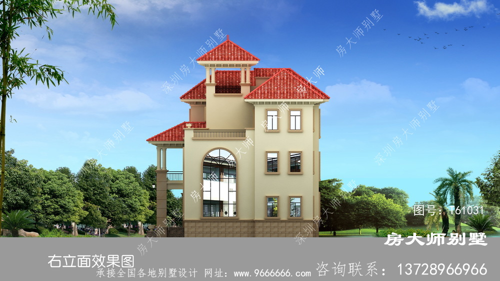 t61031号别墅外墙主要材料:外墙涂料、西瓦、砂岩石窗套装饰线、砂岩石、铁艺栏杆 |