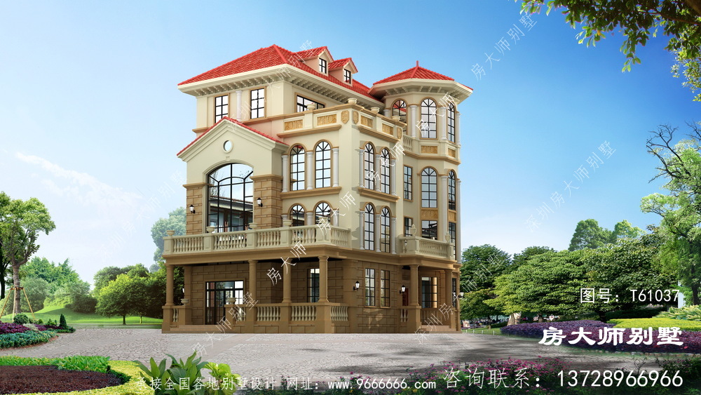 t61037号别墅外墙主要材料:首层外墙贴砂岩石、二三四层外墙天然岩石漆、砂岩石浮雕、屋面西瓦、GRC构件 |