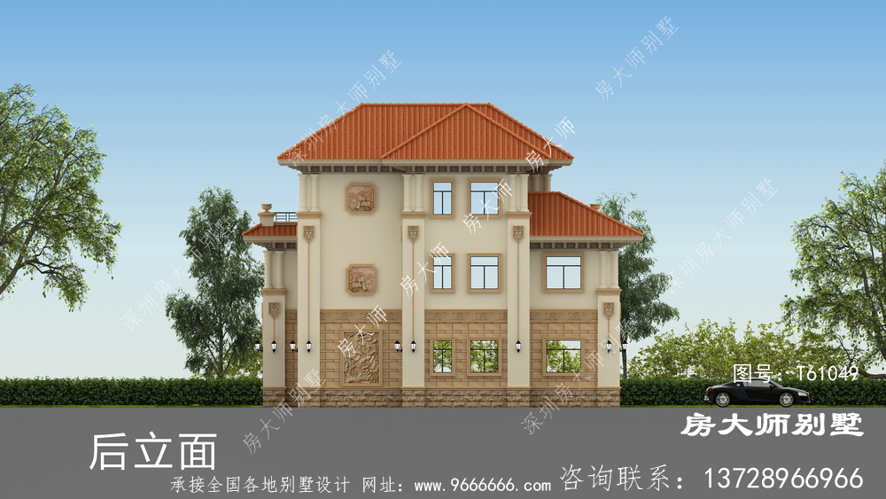 t61049号别墅外墙材料:天然岩石漆、天然砂岩石板材、天然砂岩石浮雕、310X310 S瓦、GRC水泥构件、铁艺栏杆