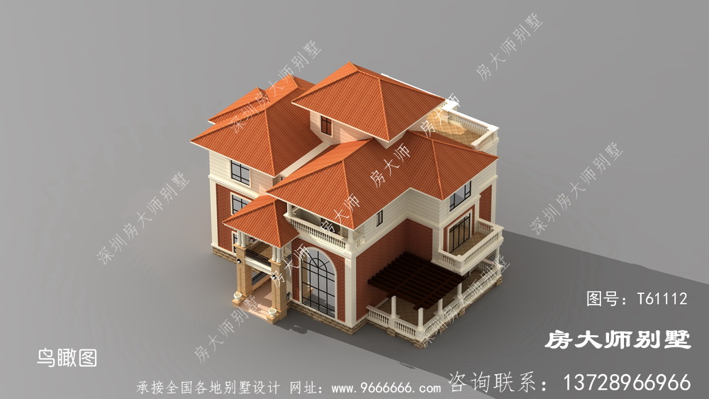t61112号别墅外墙主要材料:外墙涂料、GRC水泥构件、西瓦、劈开砖、墙裙蘑菇石
