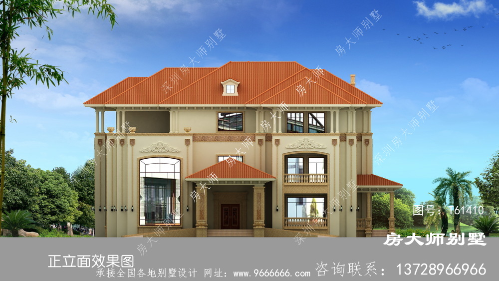 t61410号别墅外墙主要材料:西瓦、真石漆、黄金贵花岗石、砂岩石浮雕