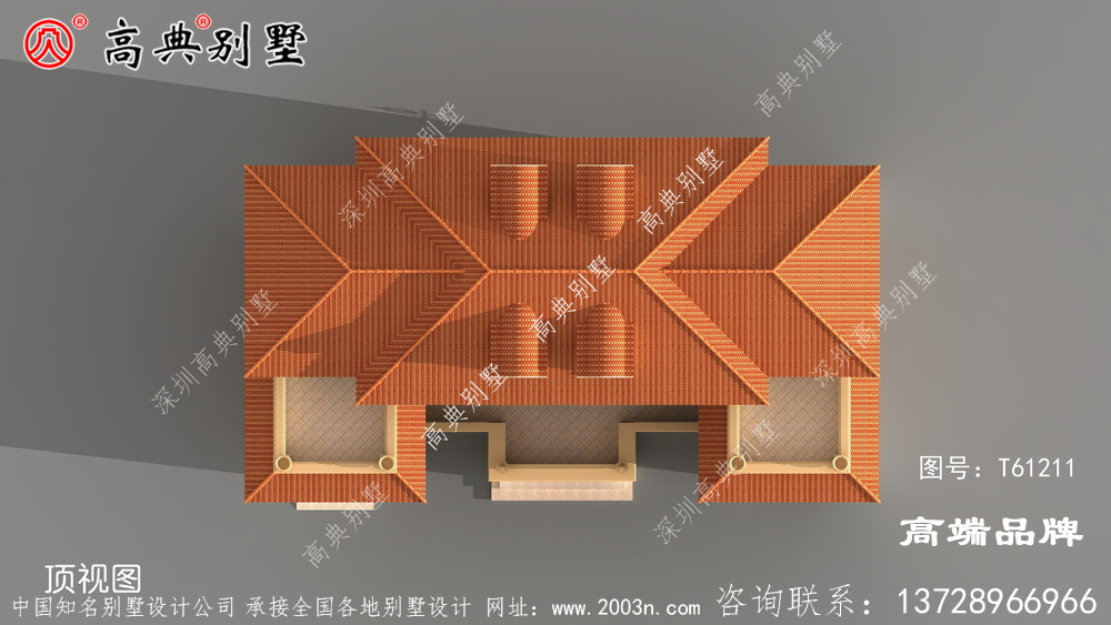 t61211号别墅外墙主要材料:外墙涂料、GRC水泥构件、西瓦、火烧面揭阳红别墅外墙石材、砂岩石浮雕 |