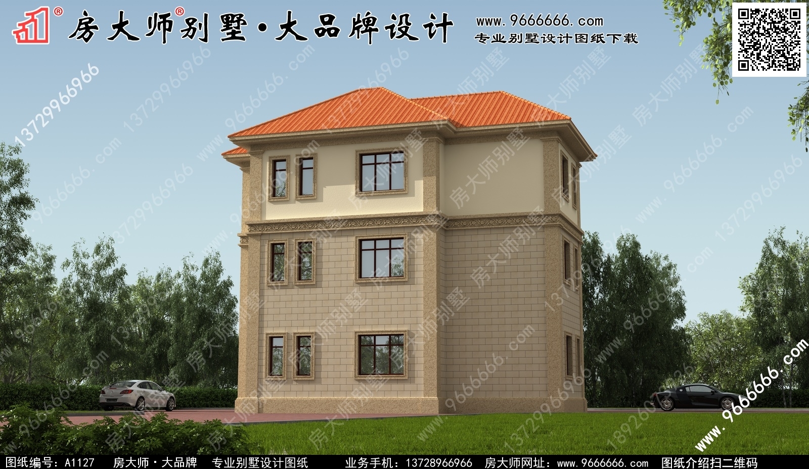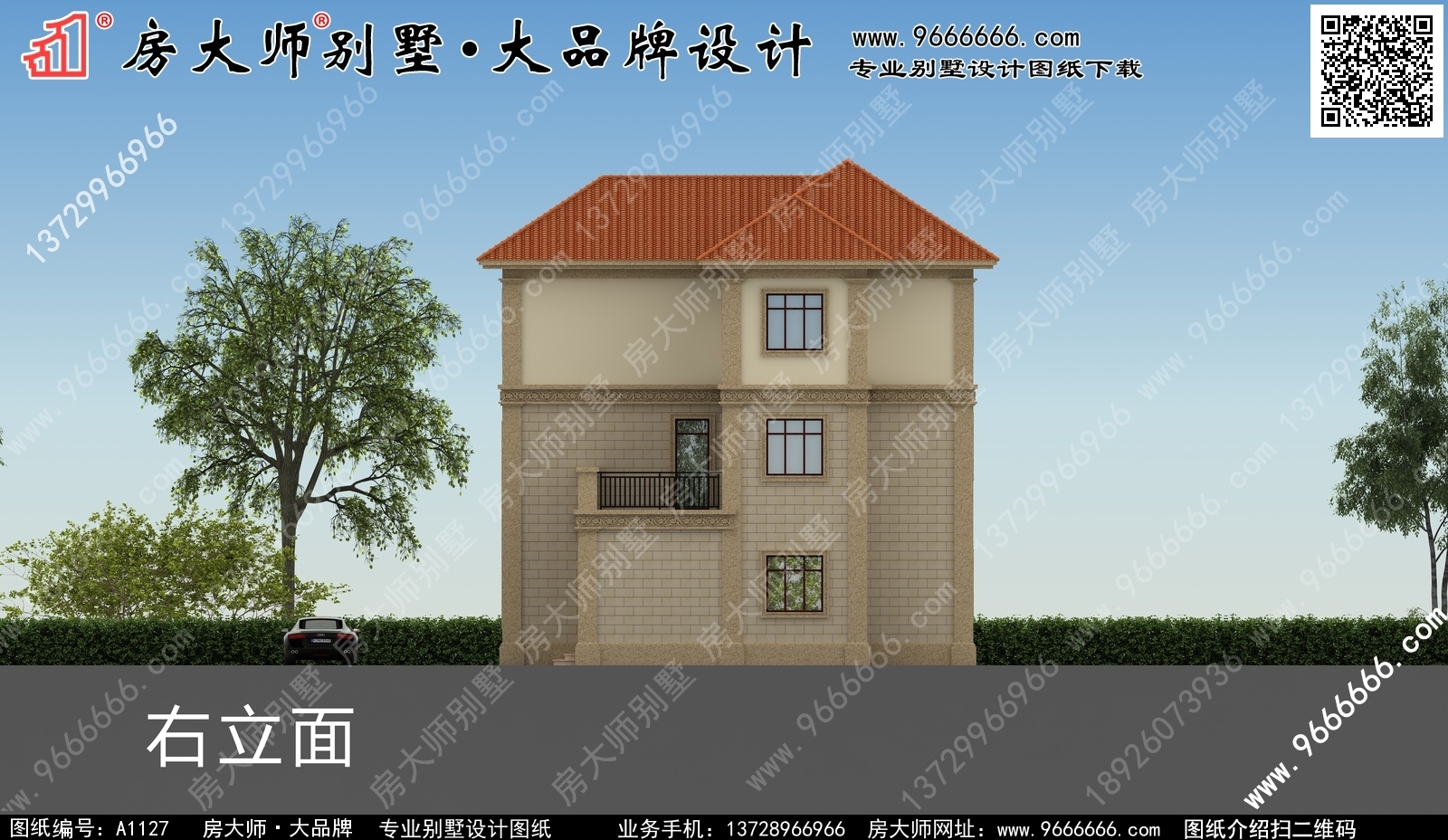 A1127号别墅外墙主要材料:真石漆、面贴火烧面黄锈石、铁艺栏杆、310X310S瓦