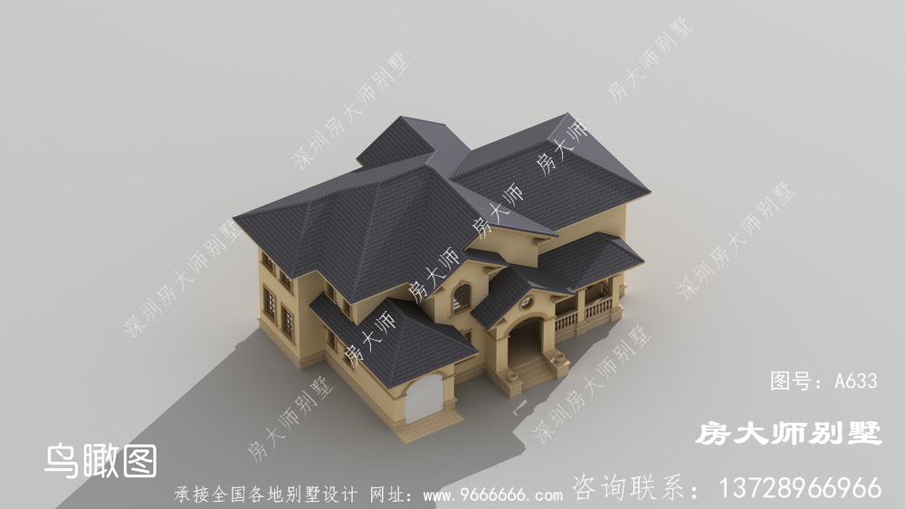 A633号别墅外墙主要材料:外墙真石漆、荔枝面黄锈石、屋面水泥平板瓦 |