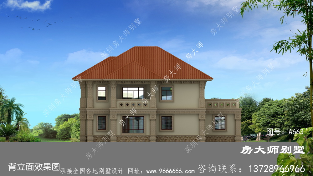 A663号别墅外墙主要材料:天然岩石漆、蘑菇面黄锈石、外墙劈开砖、水泥装饰构件线条、屋面310X310S瓦 |