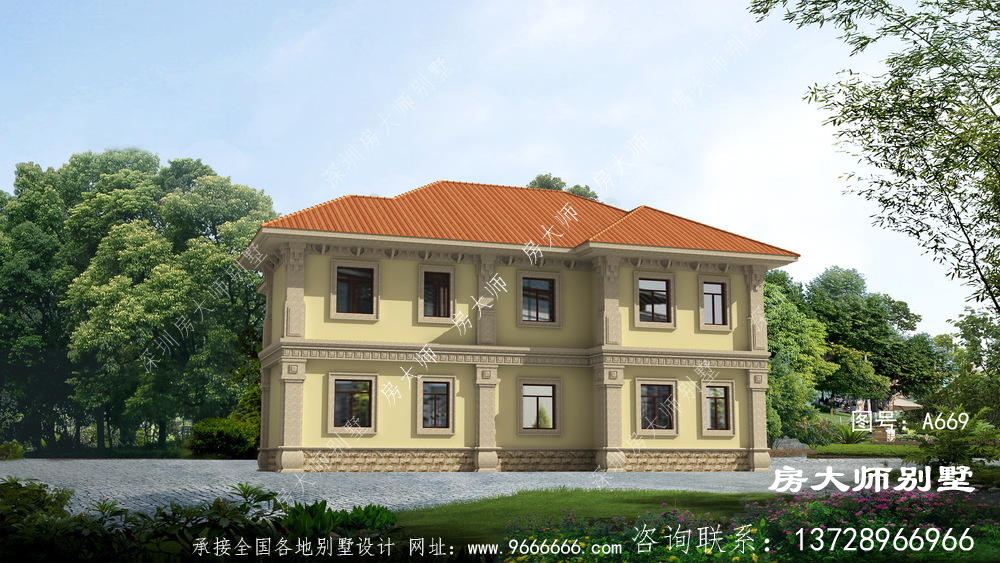 A669号别墅外墙主要材料:天然岩石漆、蘑菇面黄锈石、水泥装饰构件线条、屋面310X310S瓦 |