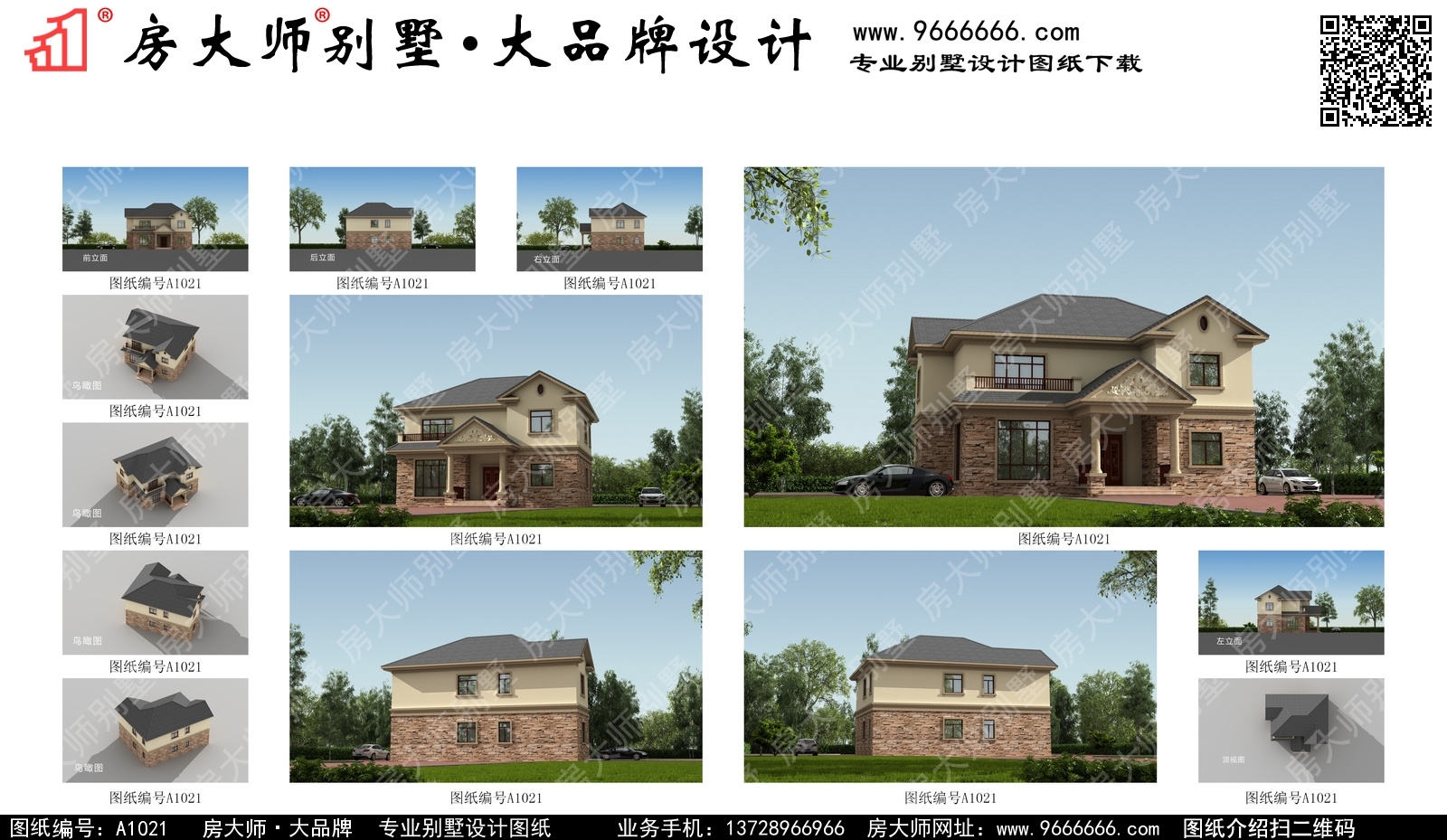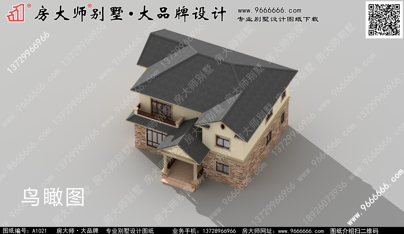 A1021号别墅外墙主要材料:真石漆、水泥平板瓦、铁艺栏杆、文化石、水泥构件