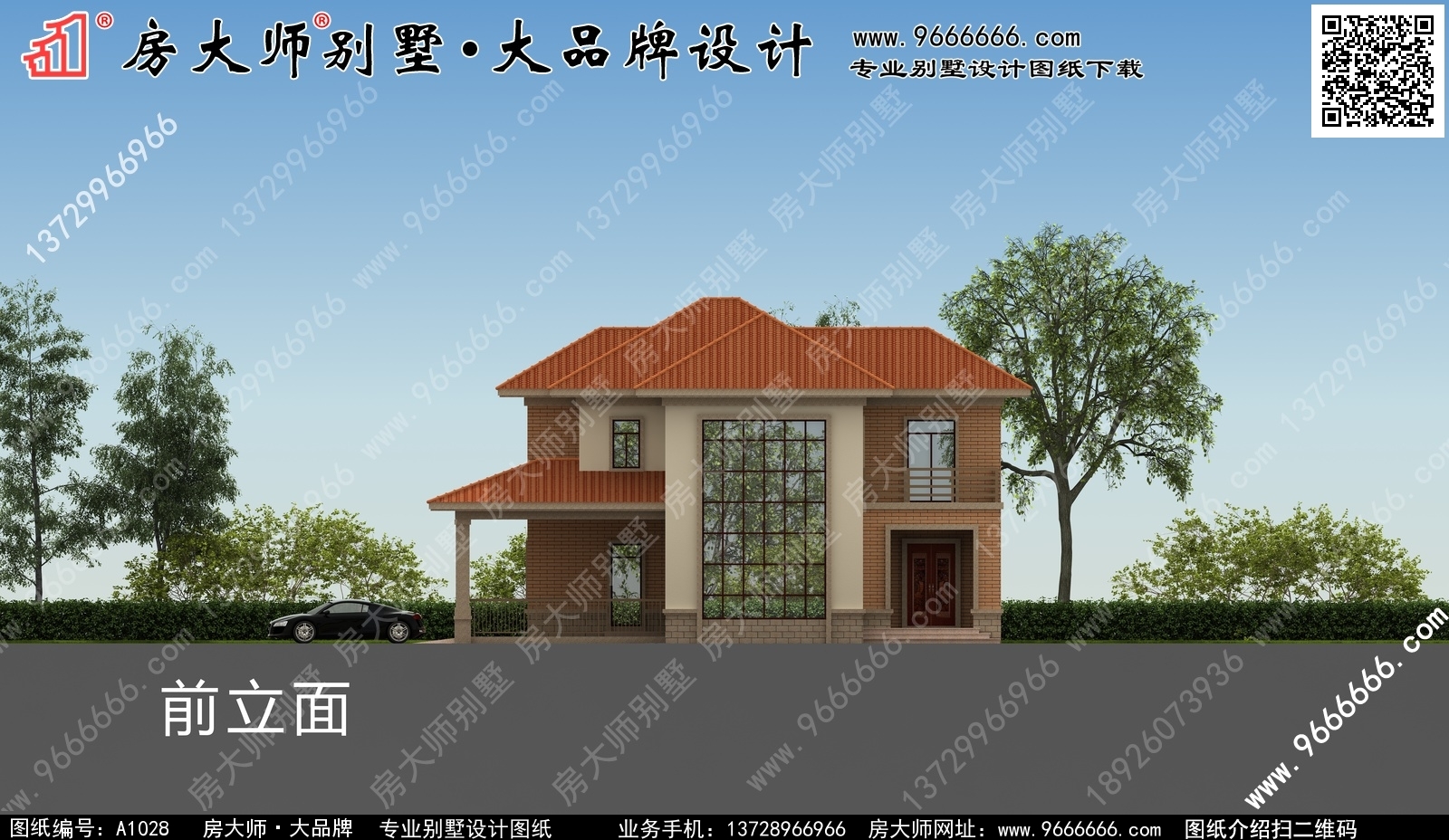 A1028号别墅外墙主要材料:外墙真石漆、屋面310X310S瓦、铁艺栏杆、墙脚黄锈石、外墙劈开砖 |
