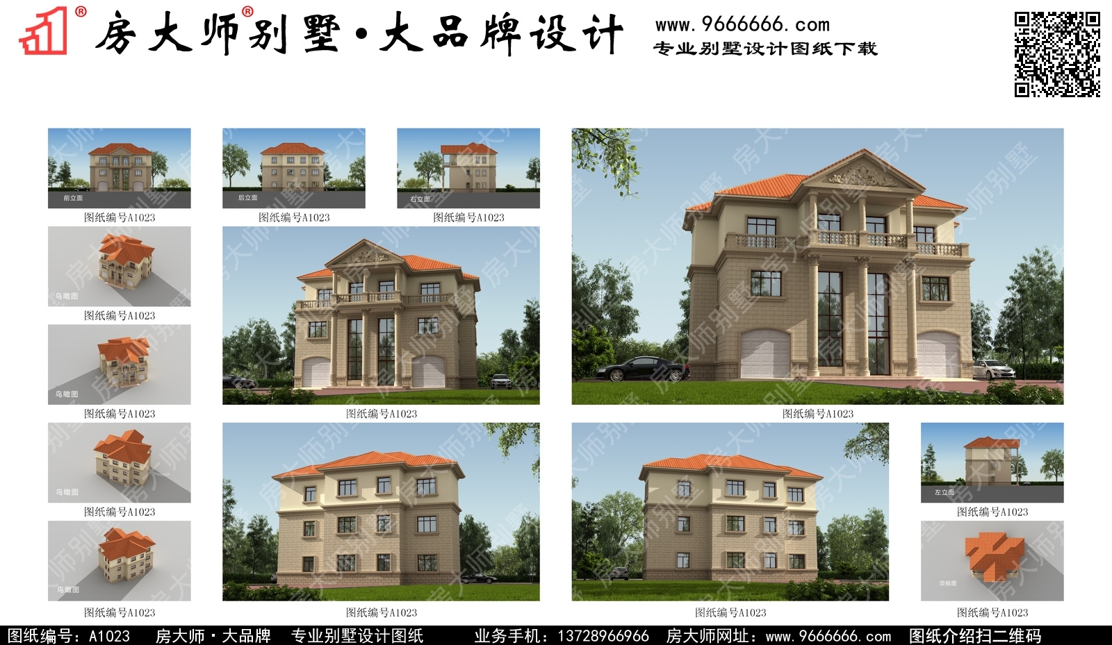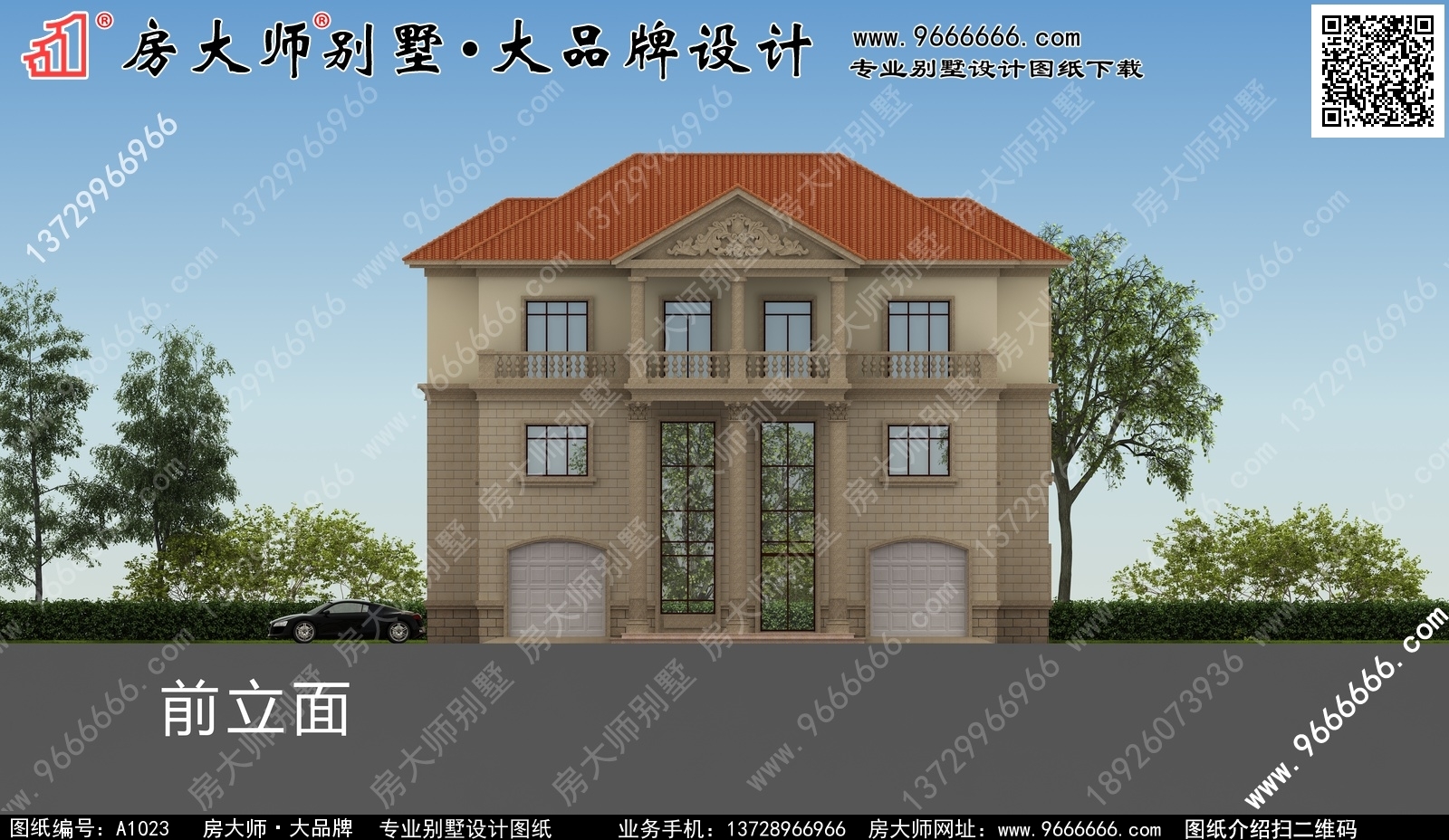 A1023号别墅外墙主要材料:外墙真石漆、310X310S瓦、墙脚荔枝面黄锈石、外墙砖、水泥构件 |