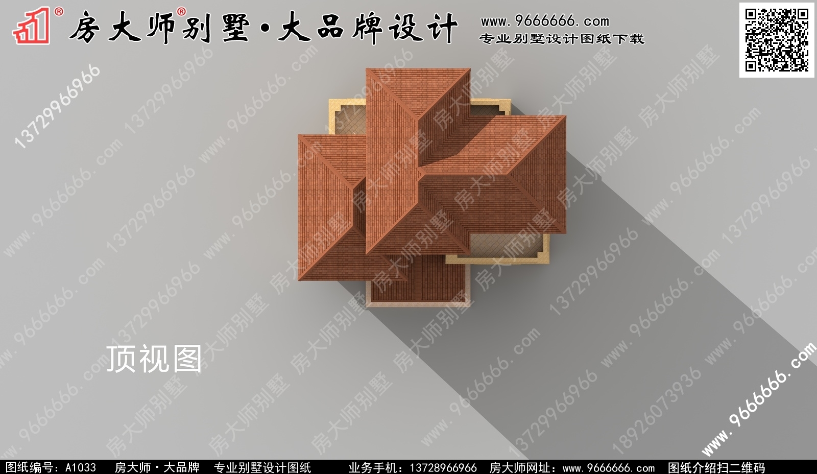 A1033号别墅外墙主要材料:蘑菇面黄锈石、劈开砖、真石漆、水泥平板瓦 |
