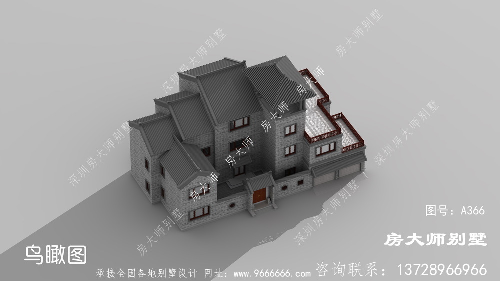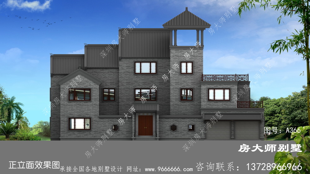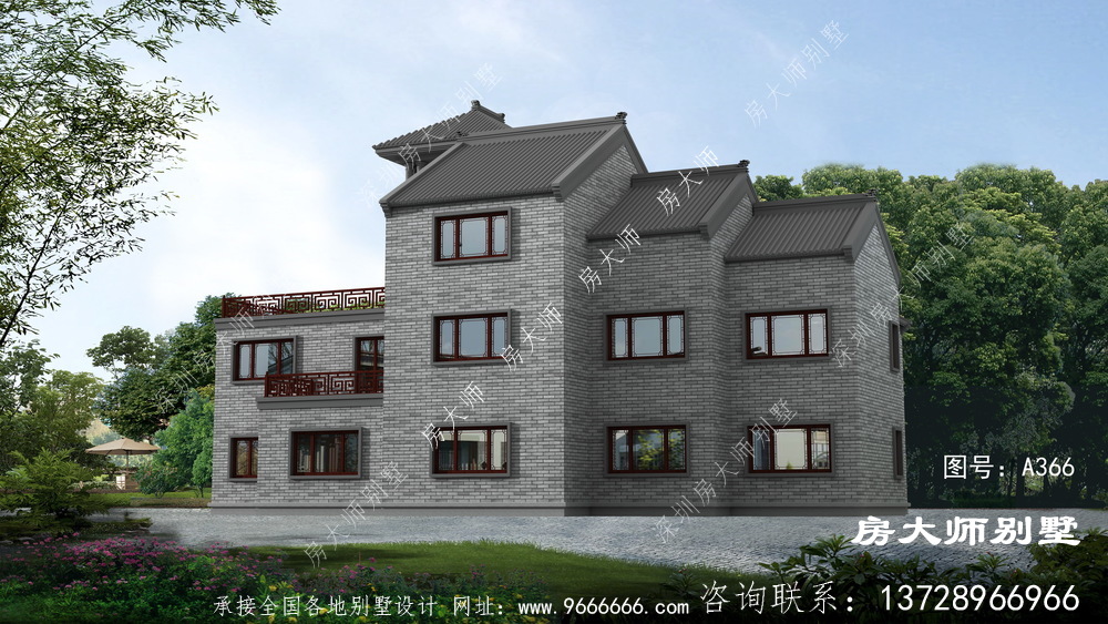 A366号别墅图纸外墙主要材料:真石漆、仿古青砖、小青瓦 |