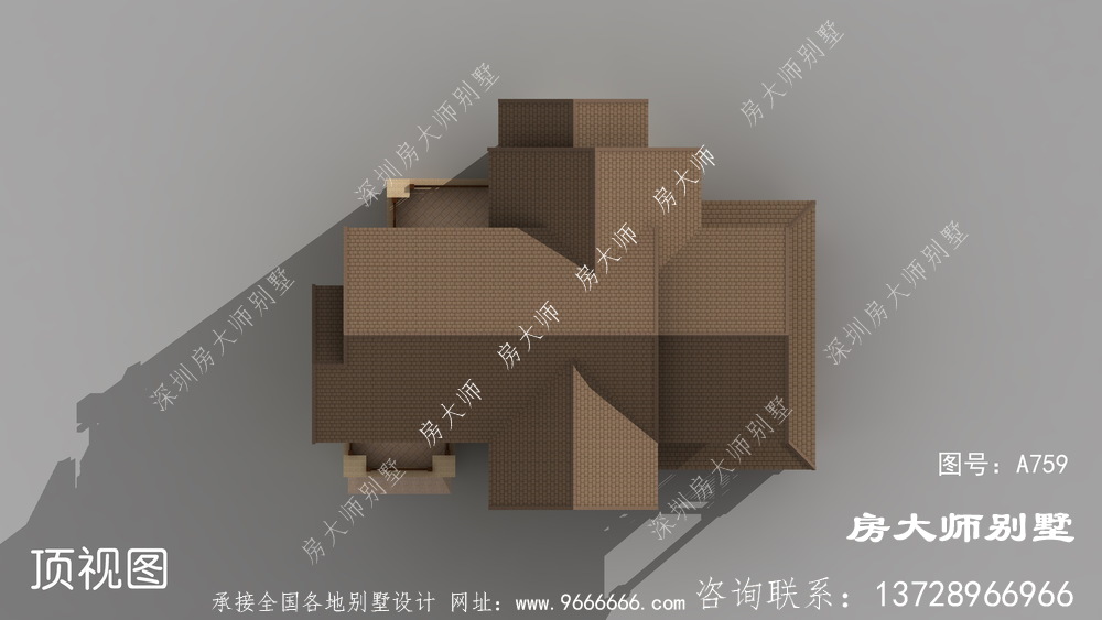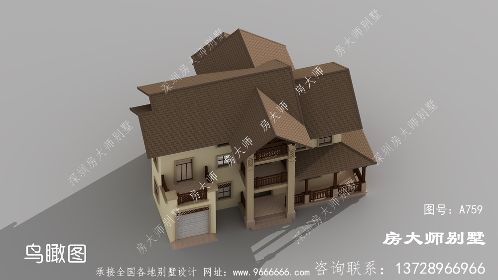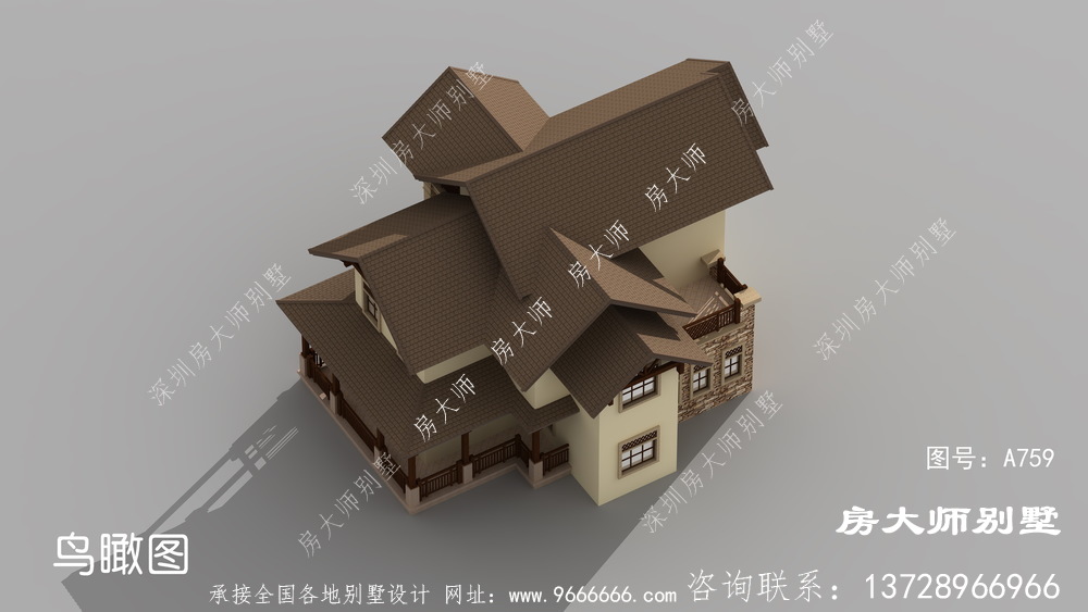 A759号别墅外墙主要材料:外墙真石漆、实木栏杆、屋面水泥平板瓦 |