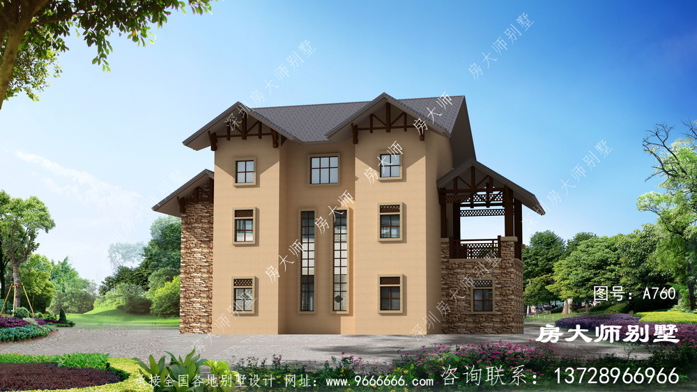 此别墅外墙主要材料:真石漆、实木栏杆、文化石、水泥平板瓦 |