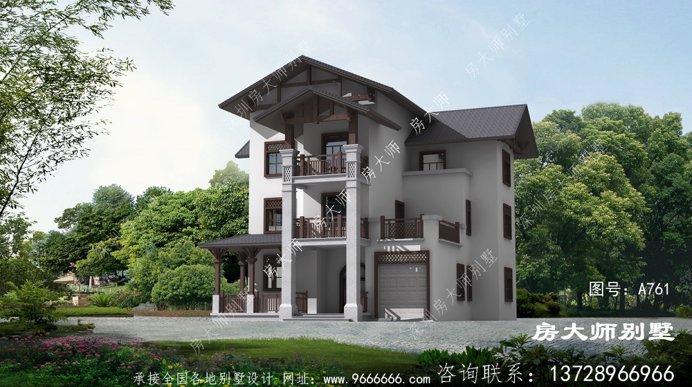 A761号别墅外墙主要材料:外墙真石漆、实木栏杆、屋面水泥平板瓦 |