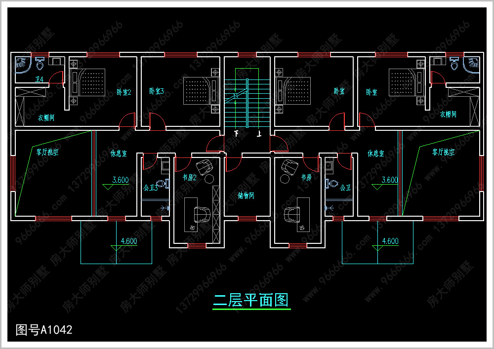 A1042号别墅是以楼梯间卫中心左右对称的双拼别墅,以下功能介绍为左面别墅为例: