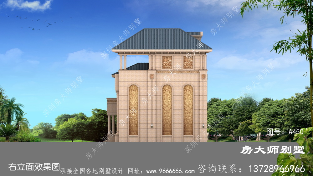 此别墅外墙主要材料:外墙纯石材干挂,火烧面揭阳红石材、屋面310X310S瓦 |