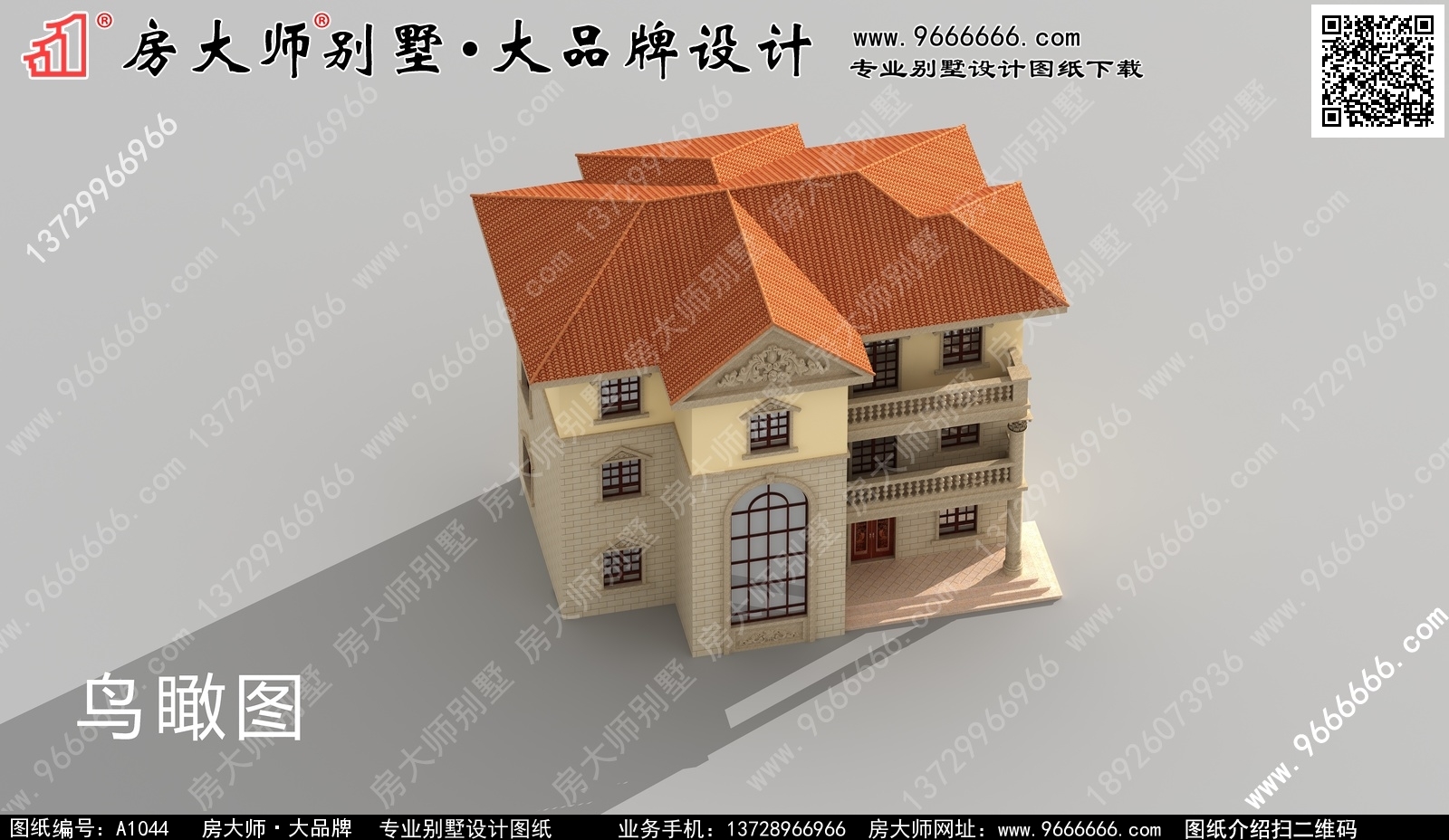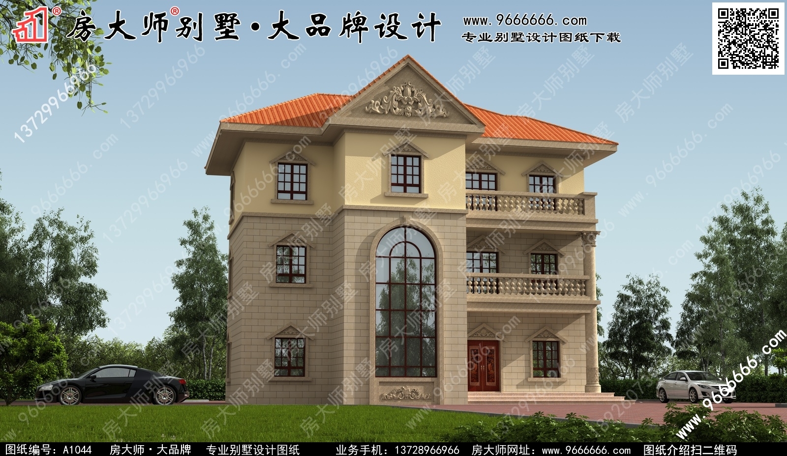 A1044号别墅外墙主要材料:真石漆、310X310S瓦、外墙砖、水泥构件、葫芦柱栏杆 |