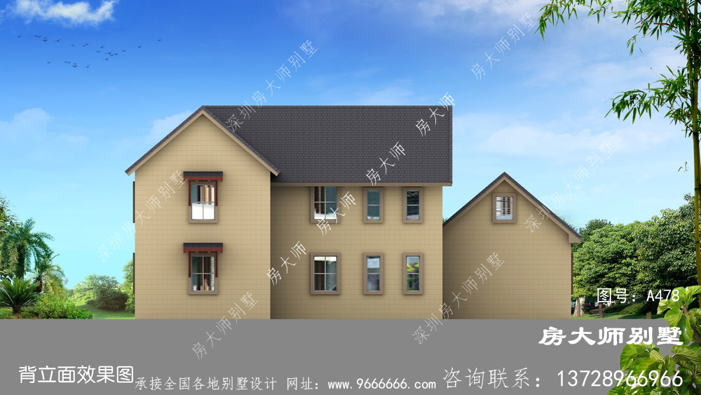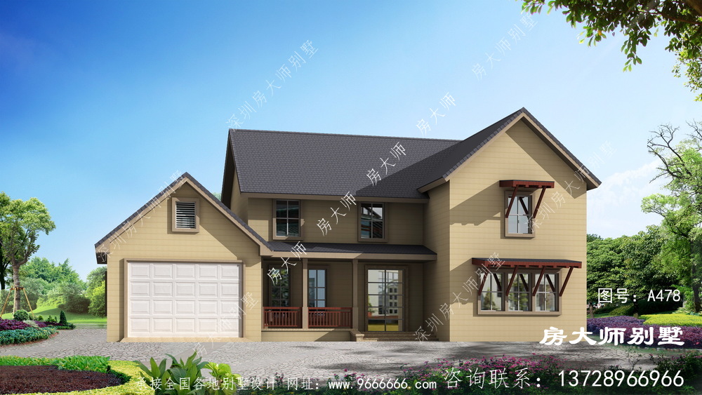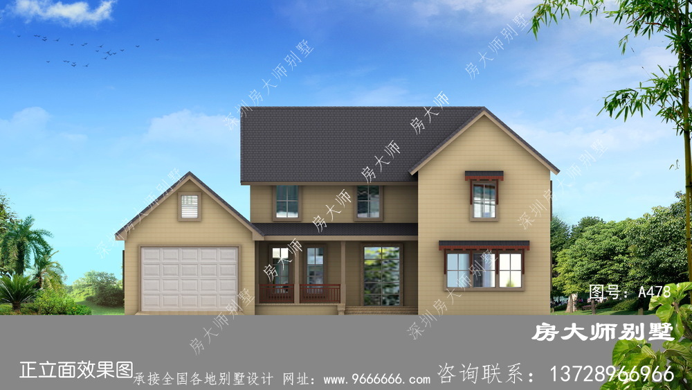 别墅外墙真石漆、木栏杆、屋面水泥平板瓦 |