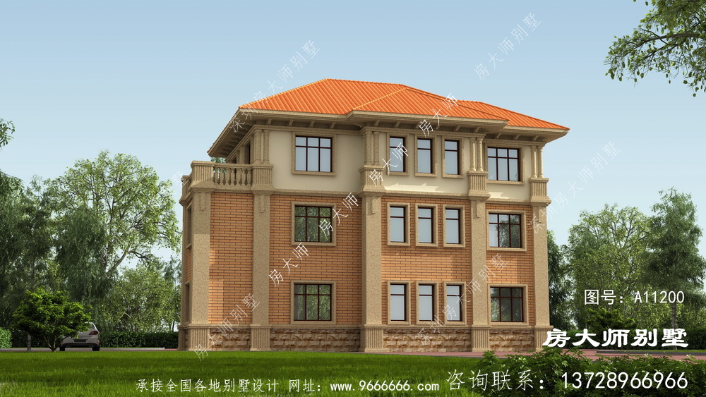 A1200号别墅外墙主要材料:蘑菇石、天然岩石漆、劈开砖、真石漆、屋面310X310S瓦 |