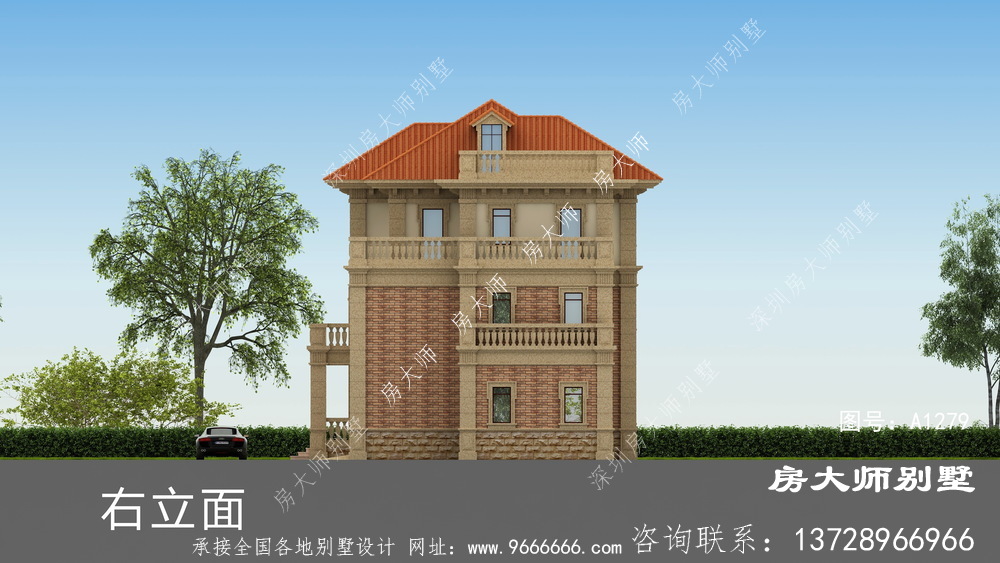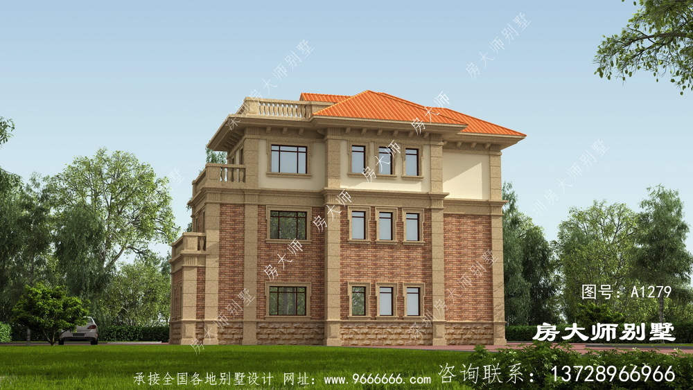 A1278号别墅外墙主要材料:S瓦、真石漆、劈开砖、蘑菇面黄锈石、GRC水泥构件 |