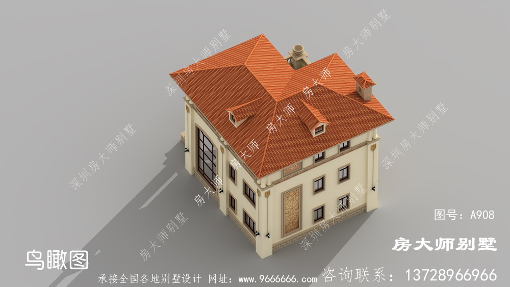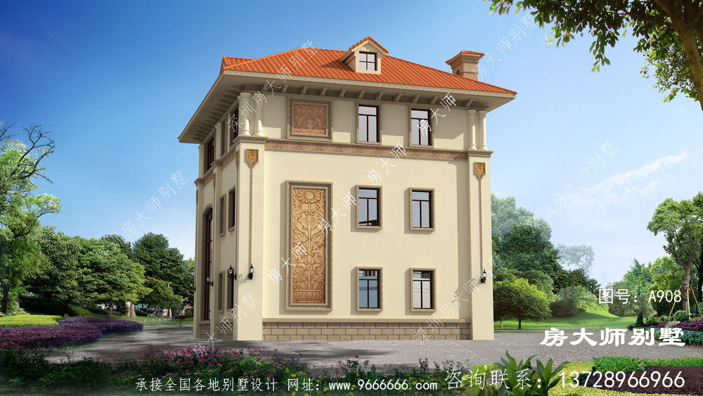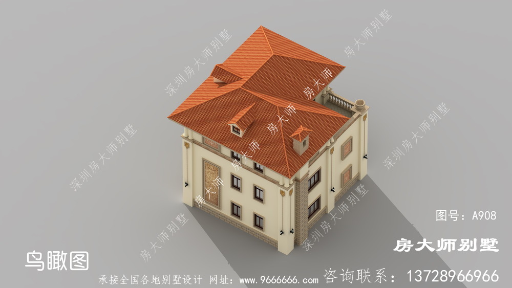A900号别墅外墙主要材料:真石漆、310X310S瓦、欧式水泥构件 |