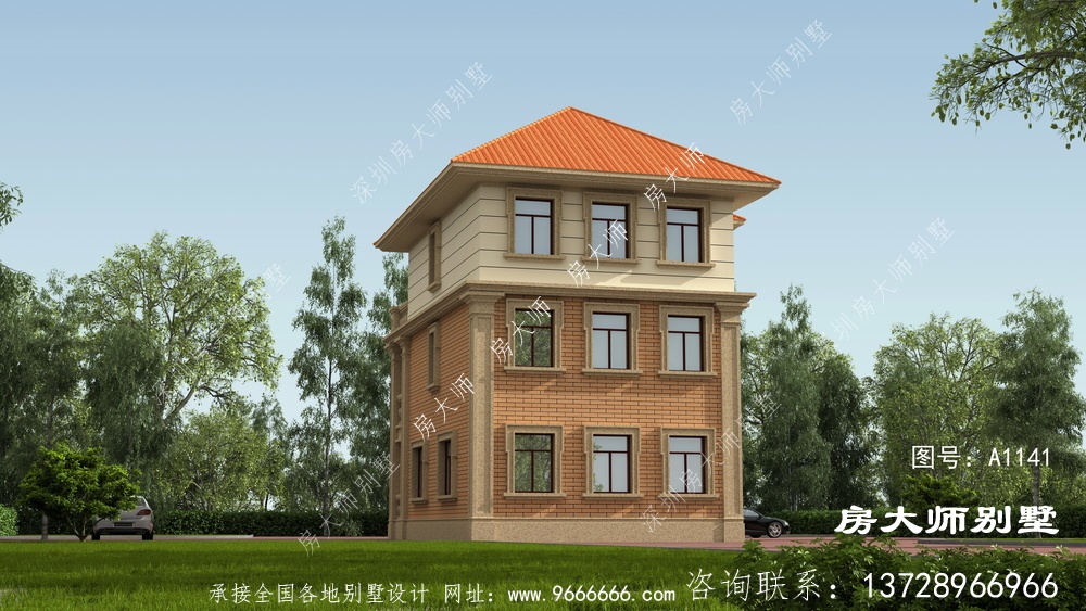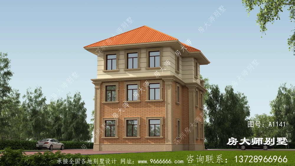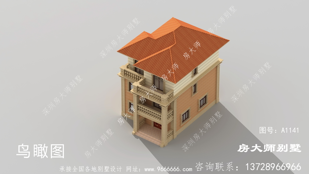 A1141号别墅外墙主要材料:水泥构件、真石漆、外墙砖、310X310S瓦 |