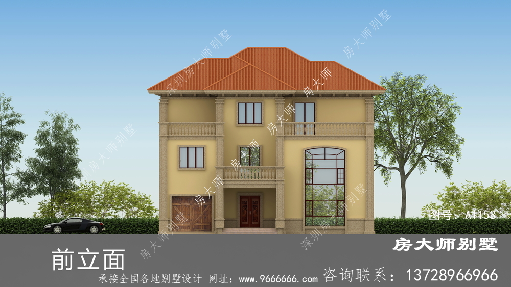 天然岩石漆、外墙欧式水泥构件线条及装饰柱、墙脚火烧面黄锈石、屋面310X310S瓦 |