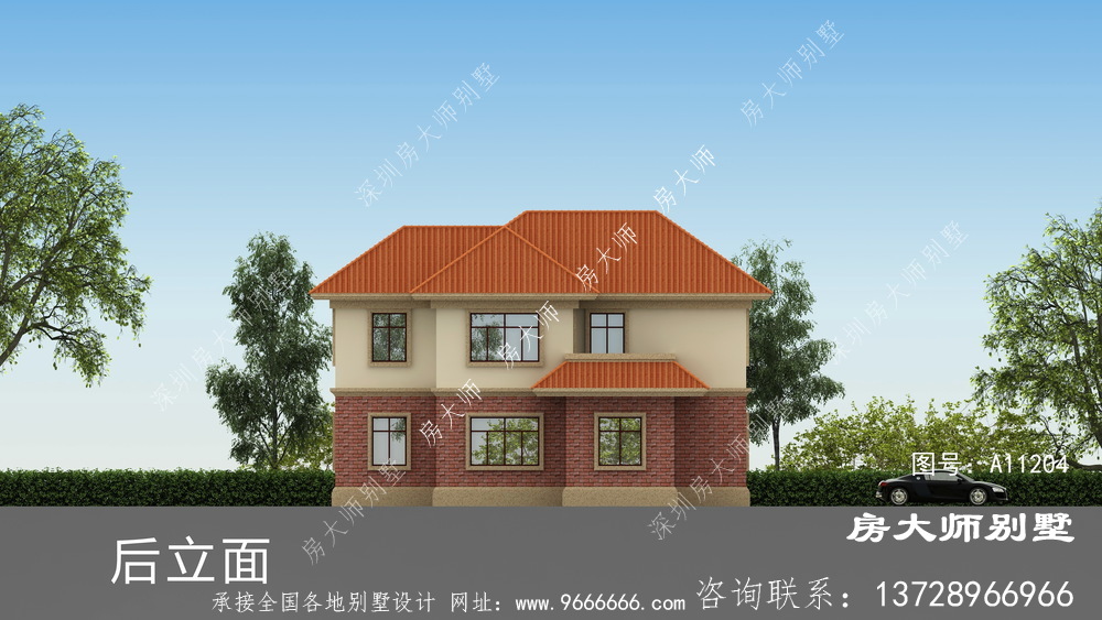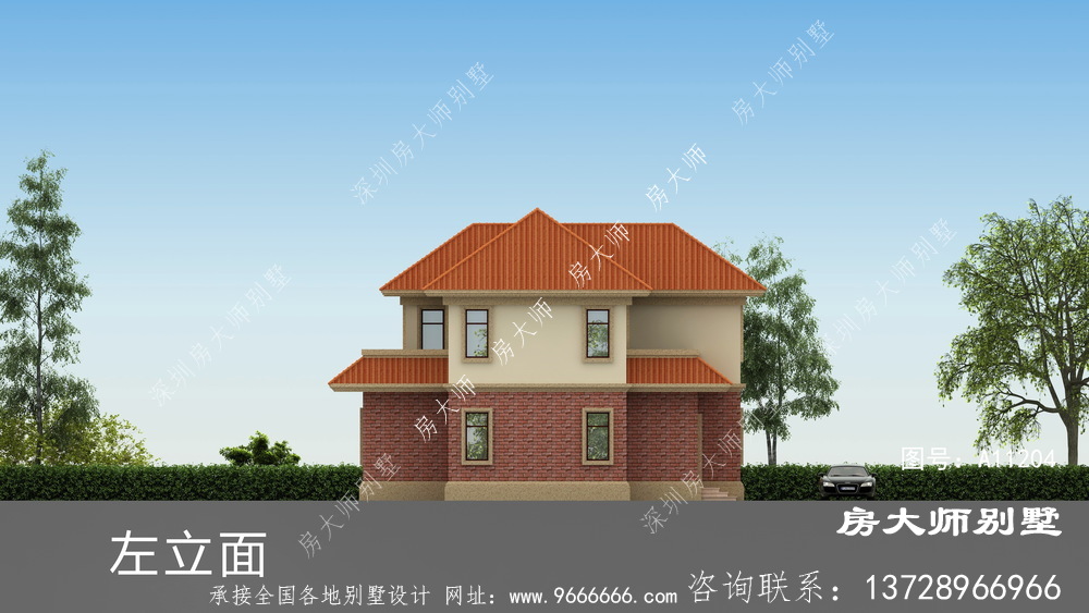 A1204号别墅外墙主要材料:劈开砖、天然岩石漆、真石漆、屋面310X310S瓦 |