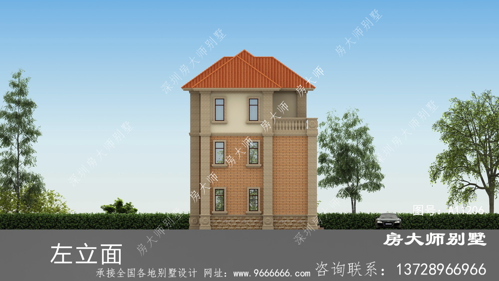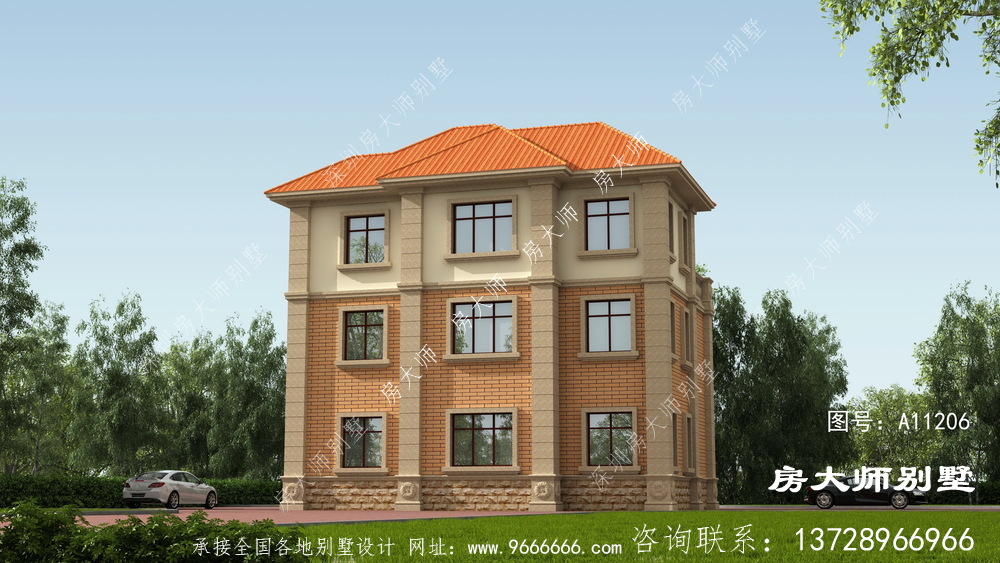 A1206号别墅外墙主要材料:蘑菇石、劈开砖、天然岩石漆、真石漆、屋面310X310S瓦 |