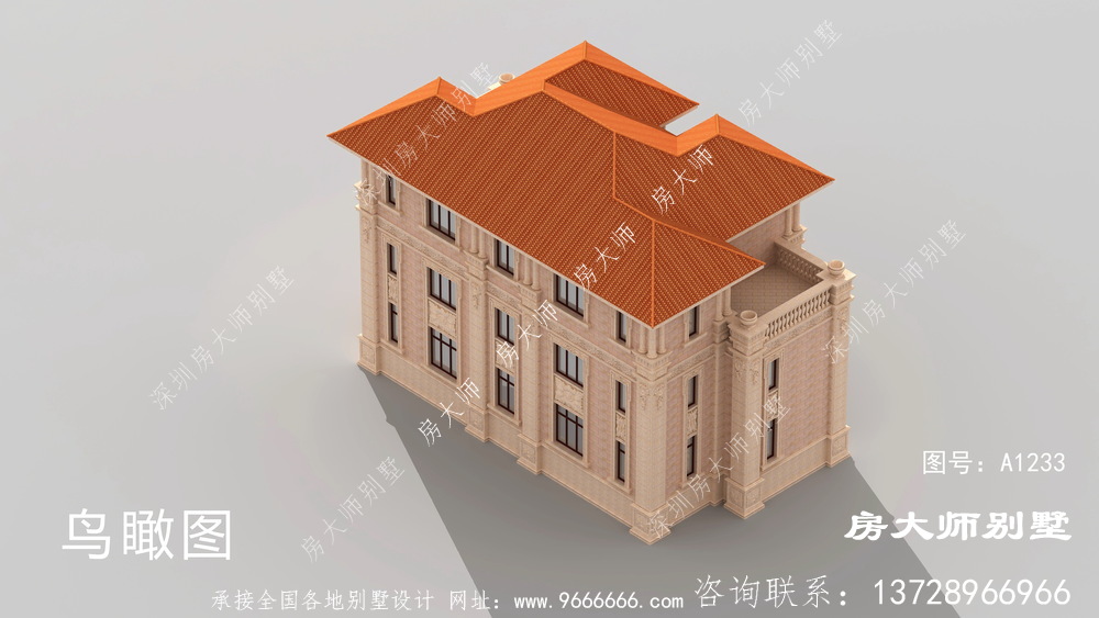 A1233号别墅外墙材料:水泥构件、真石漆、310X310S瓦、外墙砖 |