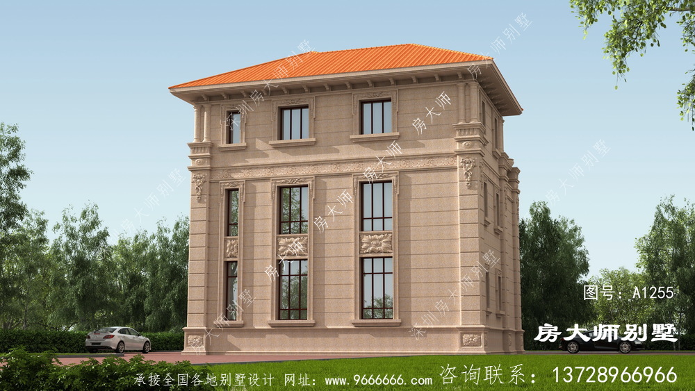 A1255号别墅外墙材料:外墙纯石材干挂、永定红石材、310X310 |