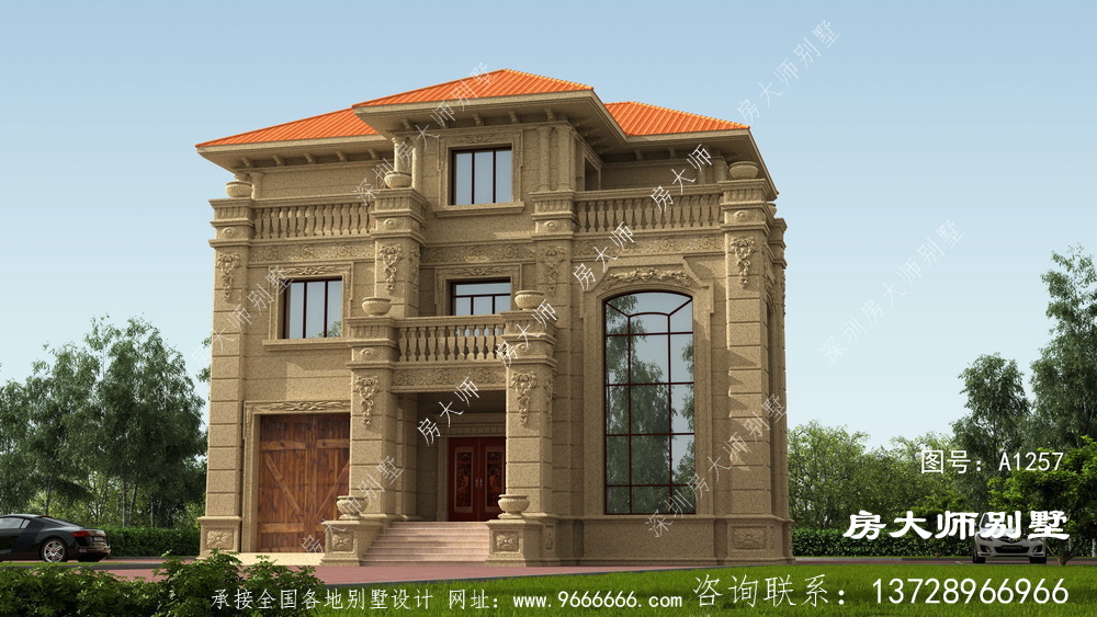 A1257号别墅外墙材料:外墙纯石材干挂、永定红石材、310X310S瓦 |