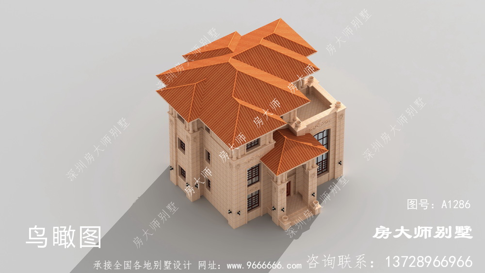 A1286号别墅外墙主要材料:S瓦、荔枝面沙漠棕石材、砂岩石浮雕 |