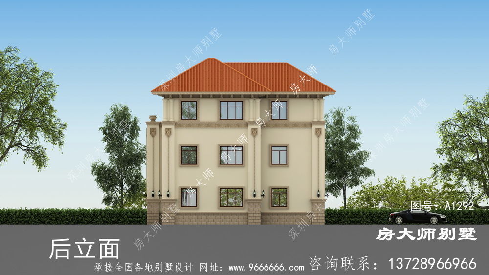 A1292号别墅外墙主要材料:荔枝面黄锈石、外墙真石漆、外墙欧式水泥构件线条及装饰柱、屋面310X310S瓦 |