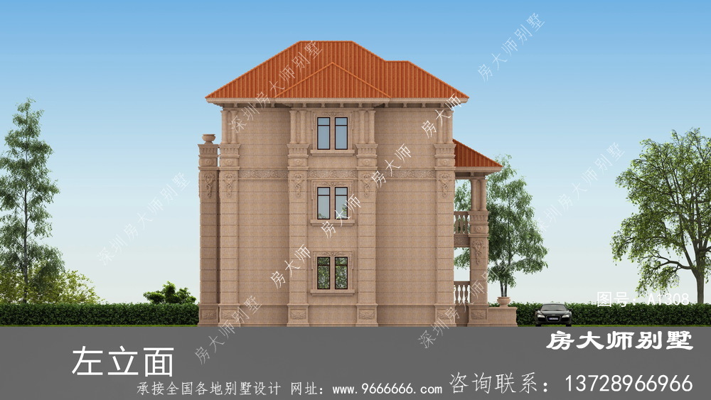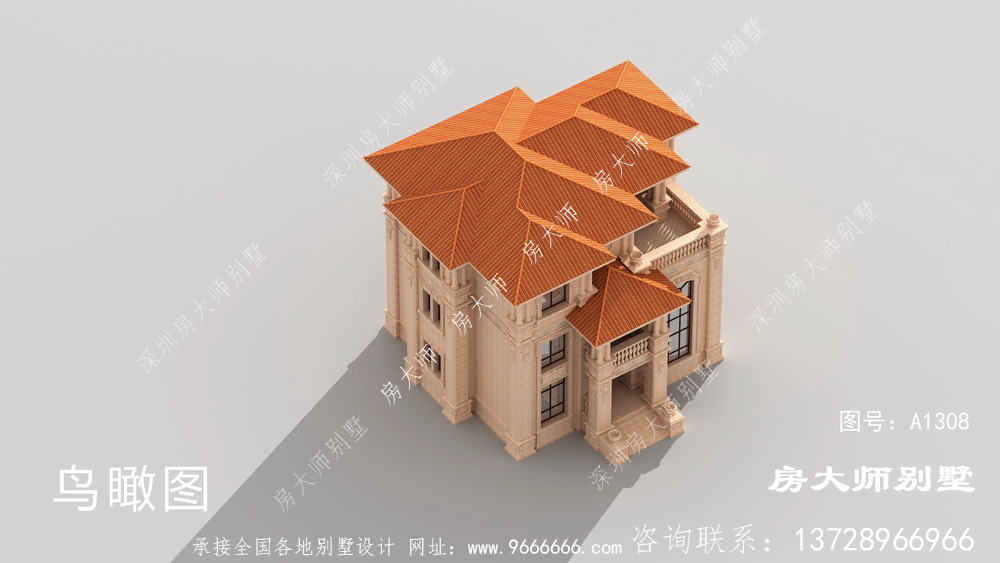 A1308号别墅外墙主要材料:310X310S瓦、外墙干挂永定红石材、石材浮雕 |