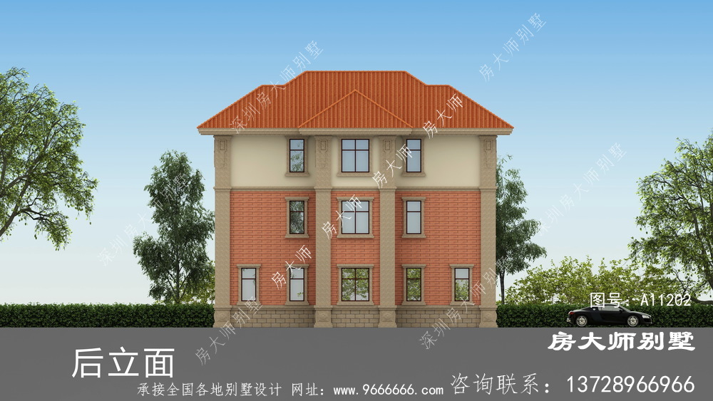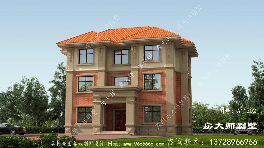 A1202号别墅外墙主要材料:黄锈石、真石漆、劈开砖、天然岩石漆、屋面310X310S瓦 |
