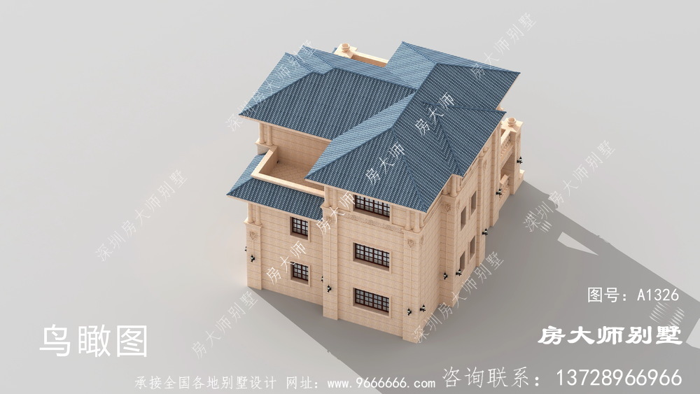 A1326号别墅外墙主要材料:外墙纯石材干挂、永定红石材、310X310S瓦