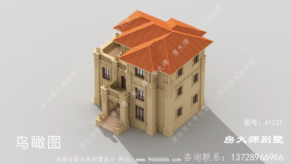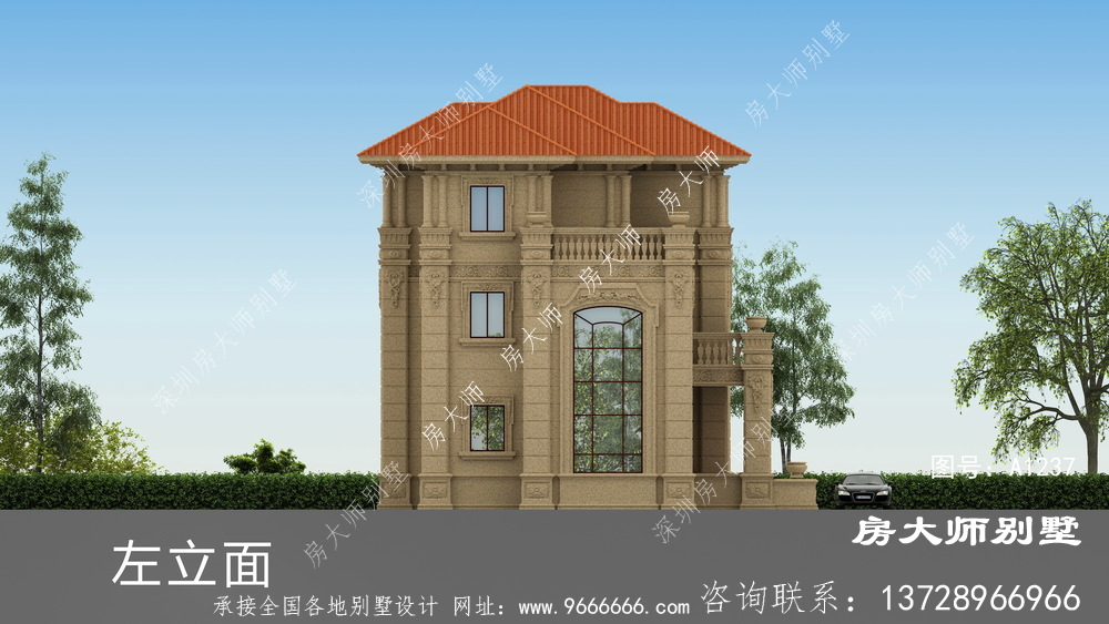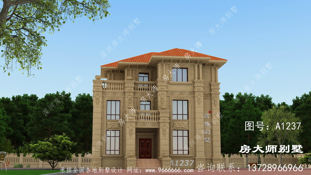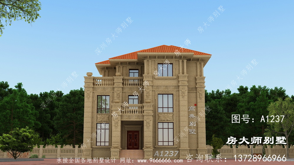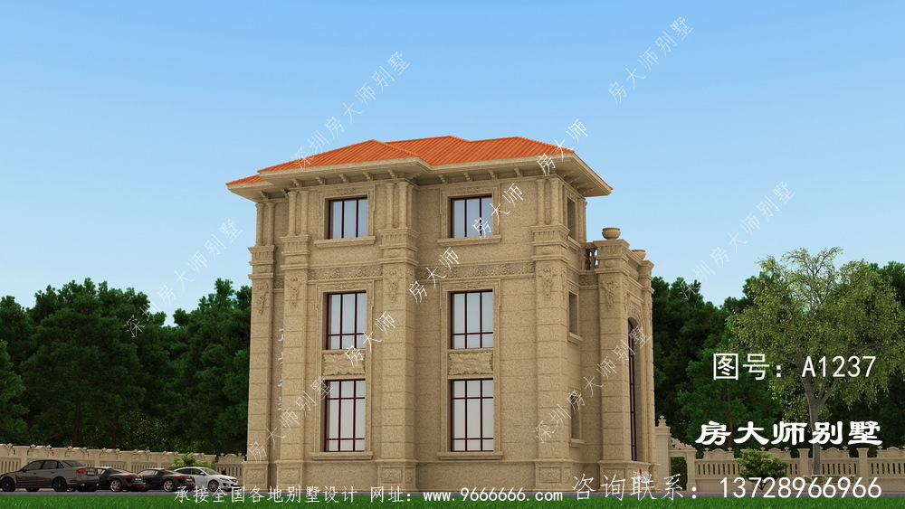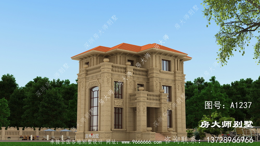 A1237号别墅外墙材料:外墙纯石材干挂、永定红石材、310X310 S瓦 |