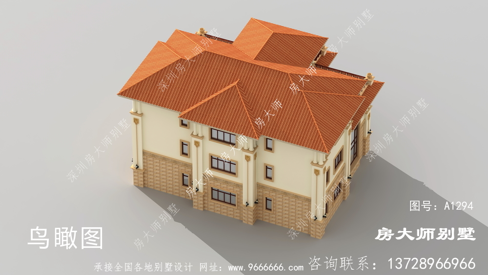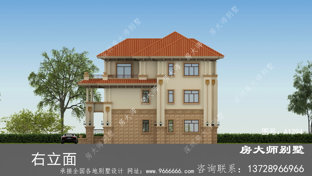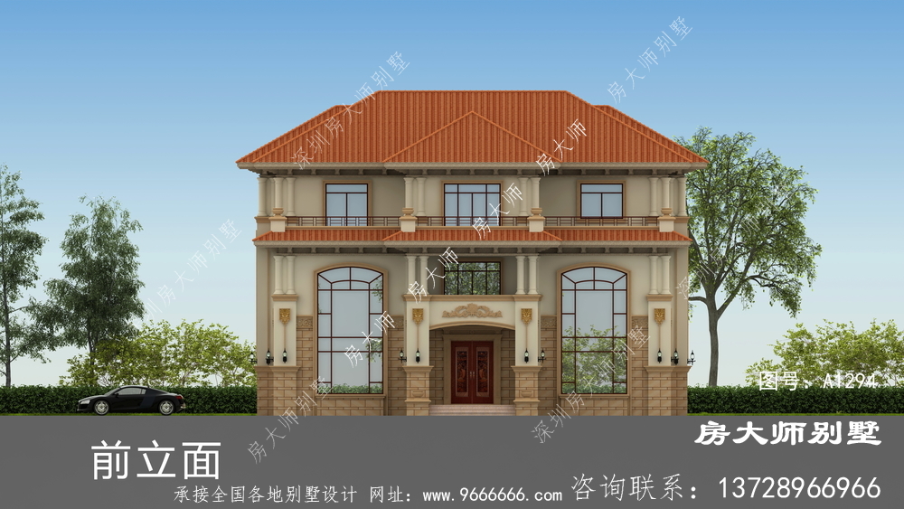 A1294号别墅外墙主要材料:砂岩石板材、真石漆、外墙欧式水泥构件线条及装饰柱、屋面310X310S瓦 |
