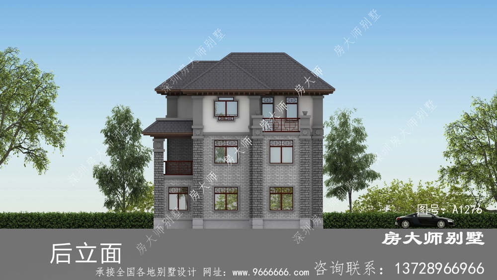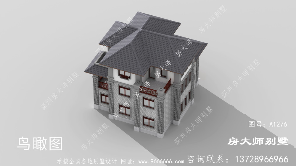 A1276号别墅外墙主要材料:水泥平板瓦、真石漆、仿古青砖、麻石 |