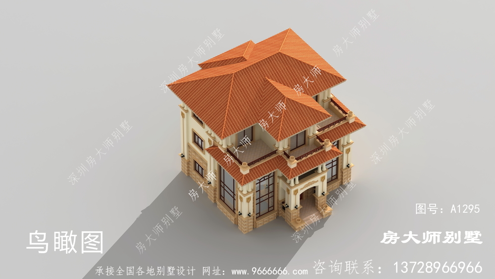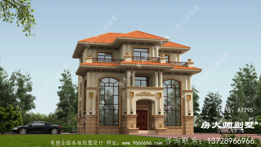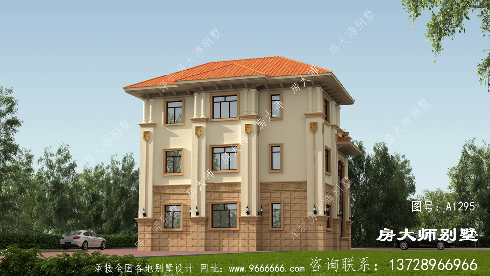 A1295号别墅外墙主要材料:砂岩石板材、真石漆、外墙欧式水泥构件线条及装饰柱、屋面310X310S瓦 |